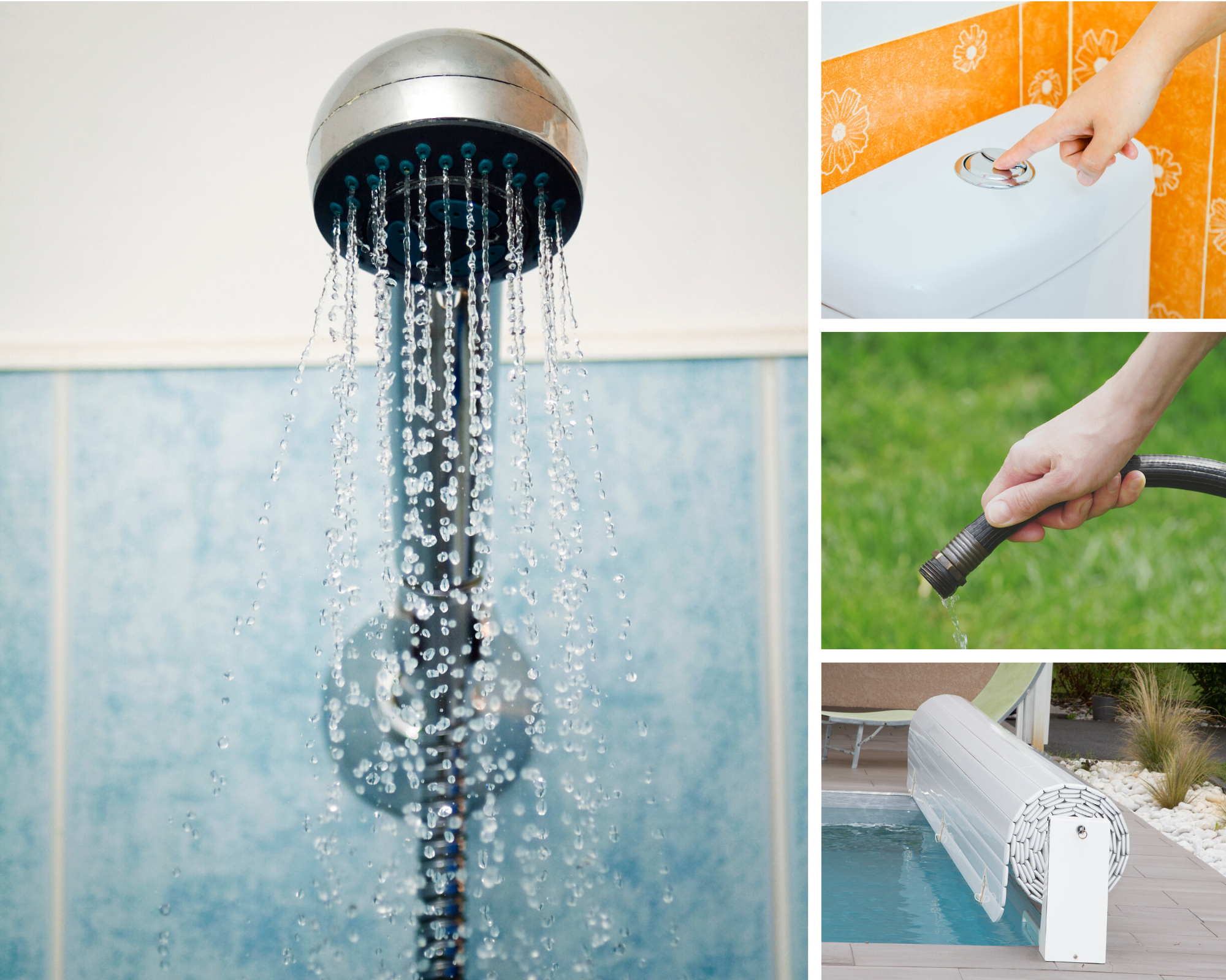 Piscina em casa: Se a piscina se não estiver em uso mantenha tampada para evitar a evaporação. Em uma piscina de tamanho médio, a perda chega a ser de 3.785 litros por mês, o suficiente para consumo de quatro pessoas por um ano.