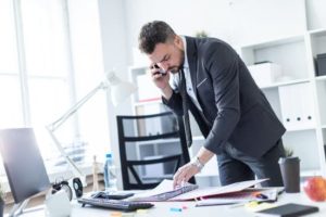 A man is standing near a table in the office, talking on the phone and flipping through documents.